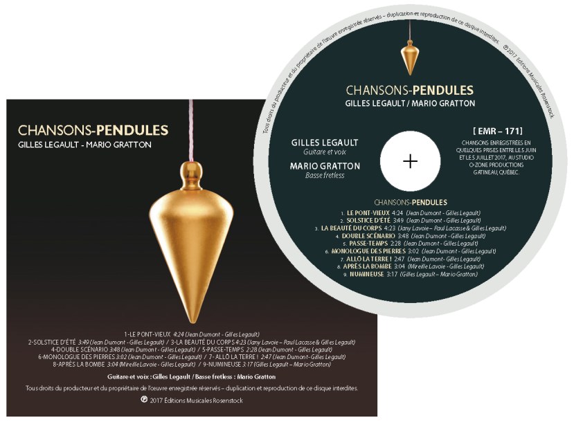 Mon ami Gilles Legault a tout de même réussi à me surprendre récemment en m’annonçant qu’il venait de lancer un nouveau CD, intitulé « Chansons-Pendules », avec son complice et allié de la première heure Mario Gratton. J’ai tout à coup eu l’impression qu’une bouffée d’air frais traversait la maison. Pendant les jours qui ont suivi, je me suis surprise à sourire sans raison, le cœur en joie. Et j’ai fini par comprendre que l’amour de la musique, que nous partageons et qui coule dans nos veines, était à l’origine de cette douce allégresse.